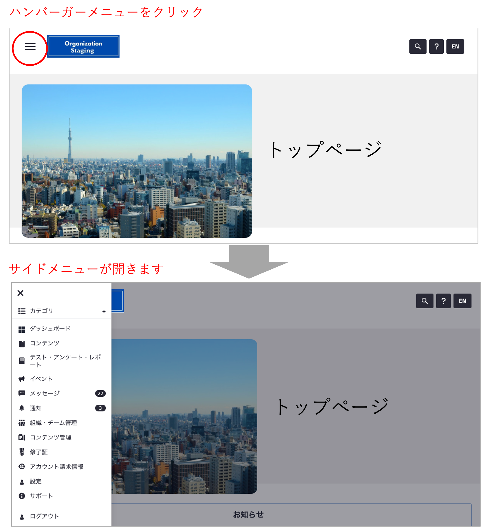 主な変更点としましては、これまでの右上メニューを廃止し、左側のサイドメニューに機能を統合します。